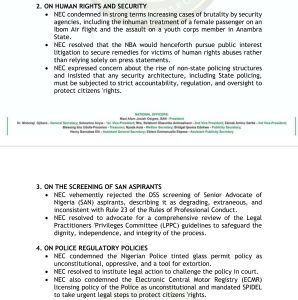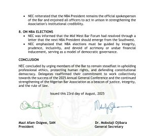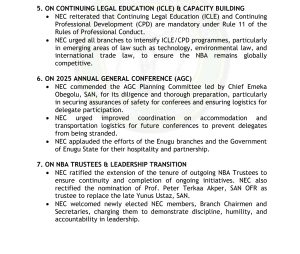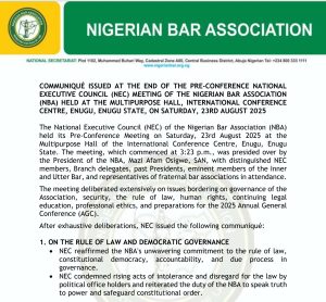 The National Executive Council (NEC) of the Nigerian Bar Association (NBA) convened its Pre-Conference Meeting on Saturday, 23rd August 2025, at the Multipurpose Hall of the International Conference Centre, Enugu, Enugu State.