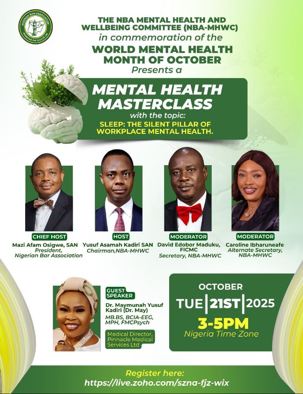 In commemoration of the World Mental Health Month of October, the Nigerian Bar Association Mental Health and Wellbeing Committee (NBA-MHWC) is pleased to invite members of the Bar and the general public to a special Mental Health Masterclass Webinar scheduled to hold as follows: