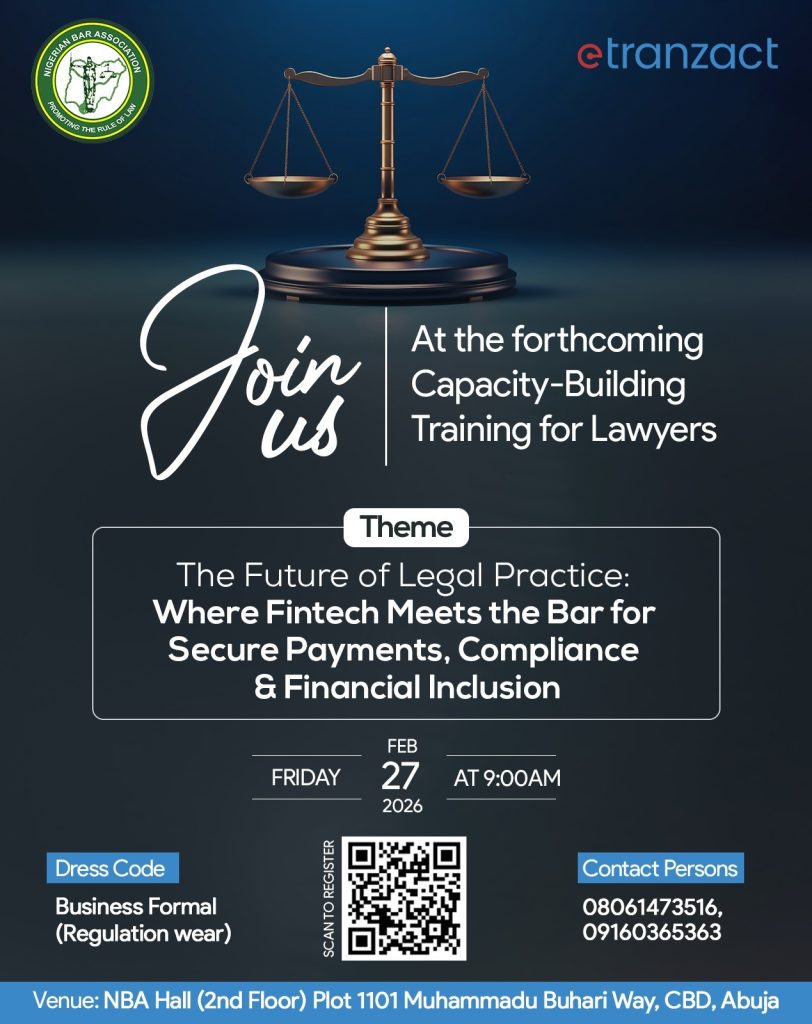 Lawyers are invited to attend a high-level training session hosted by the Nigerian Bar Association Institute of Continuing Legal Education (NBA-ICLE) in collaboration with eTranzact International plc, holding today, 27 February 2026, at 9:00am.