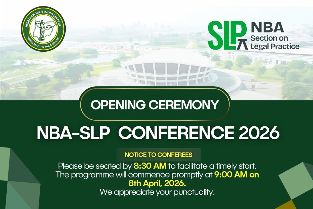 Delegates attending the Nigerian Bar Association Section on Legal Practice (NBA-SLP) Conference 2026 are kindly requested to be seated by 8:30 AM to ensure a smooth and timely commencement of proceedings.