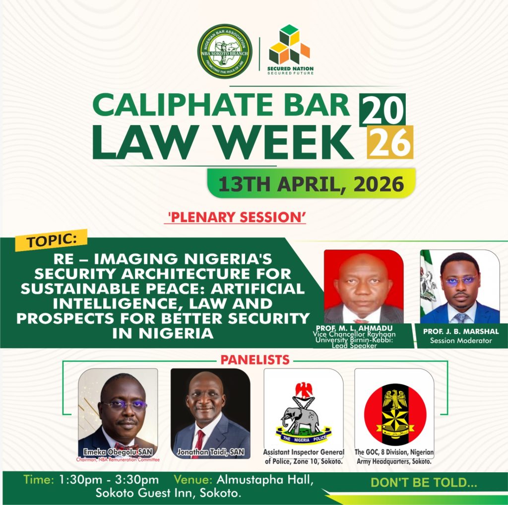 The Nigerian Bar Association (NBA), Sokoto Branch, has announced a high-level plenary session as part of the Caliphate Bar Law Week 2026, focusing on the integration of technology and law to address Nigeria’s security challenges.