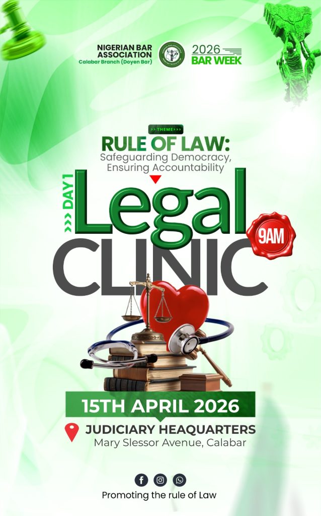 The Nigerian Bar Association (NBA), Calabar Branch will commence its 2026 Bar Week on Wednesday, April 15, 2026, with a Legal Clinic, a flagship outreach initiative through which legal practitioners will offer free professional advice and services to members of the public.