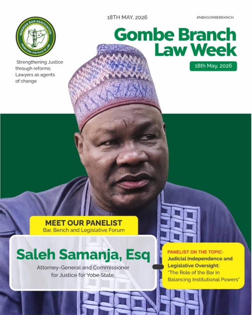 GOMBE, NIGERIA – The Nigerian Bar Association (NBA) Gombe Branch has announced that the Attorney-General and Commissioner for Justice for Yobe State, Saleh Samanja, Esq., will feature as a distinguished panelist for the upcoming Gombe Branch Law Week. Scheduled for 18th May 2026, the event will center on the theme: “Strengthening Justice through reforms: Lawyers as agents of change.”